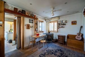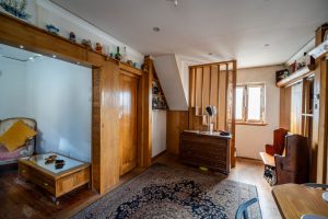 On the entrance floor, there is the dining room, living room, kitchen, bathroom, smaller bedroom, and a small storage space.