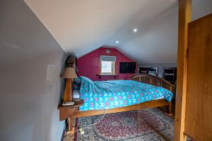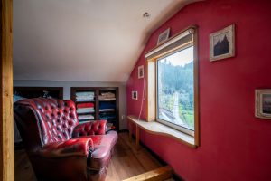 On the upper floor, there is the master bedroom with an open wardrobe and a view of the hills and forest.