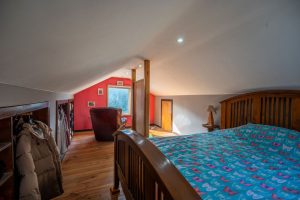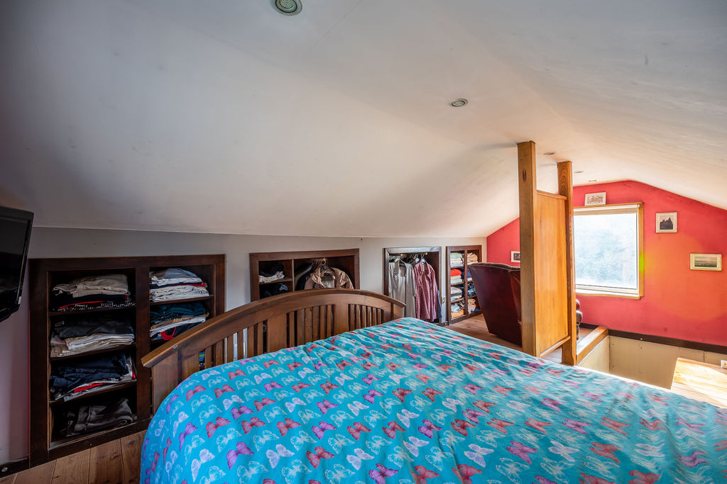 No piso superior, está o quarto principal, com guarda-roupa aberto e uma vista para os montes e a floresta.