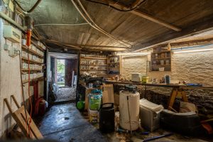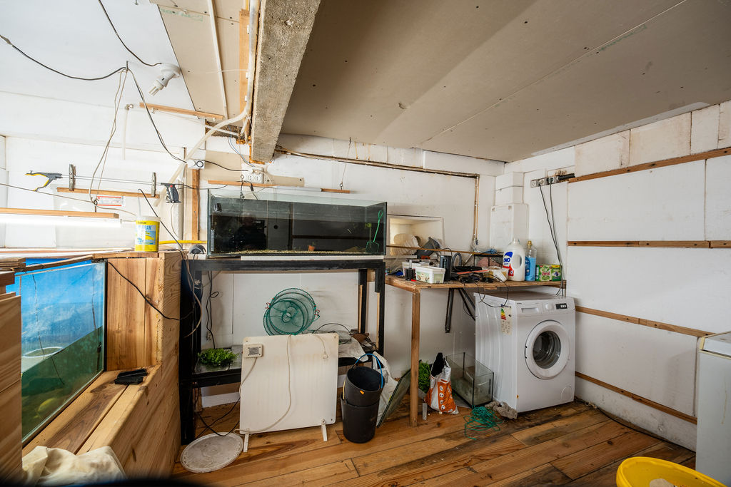 Por baixo da casa há 3 espaços de arrumos, num dos quais está construído um grande aquário, que faz parte da casa.
