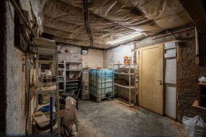 Underneath the house, there are three storage spaces, one of which has a large aquarium built into it, which is part of the house.